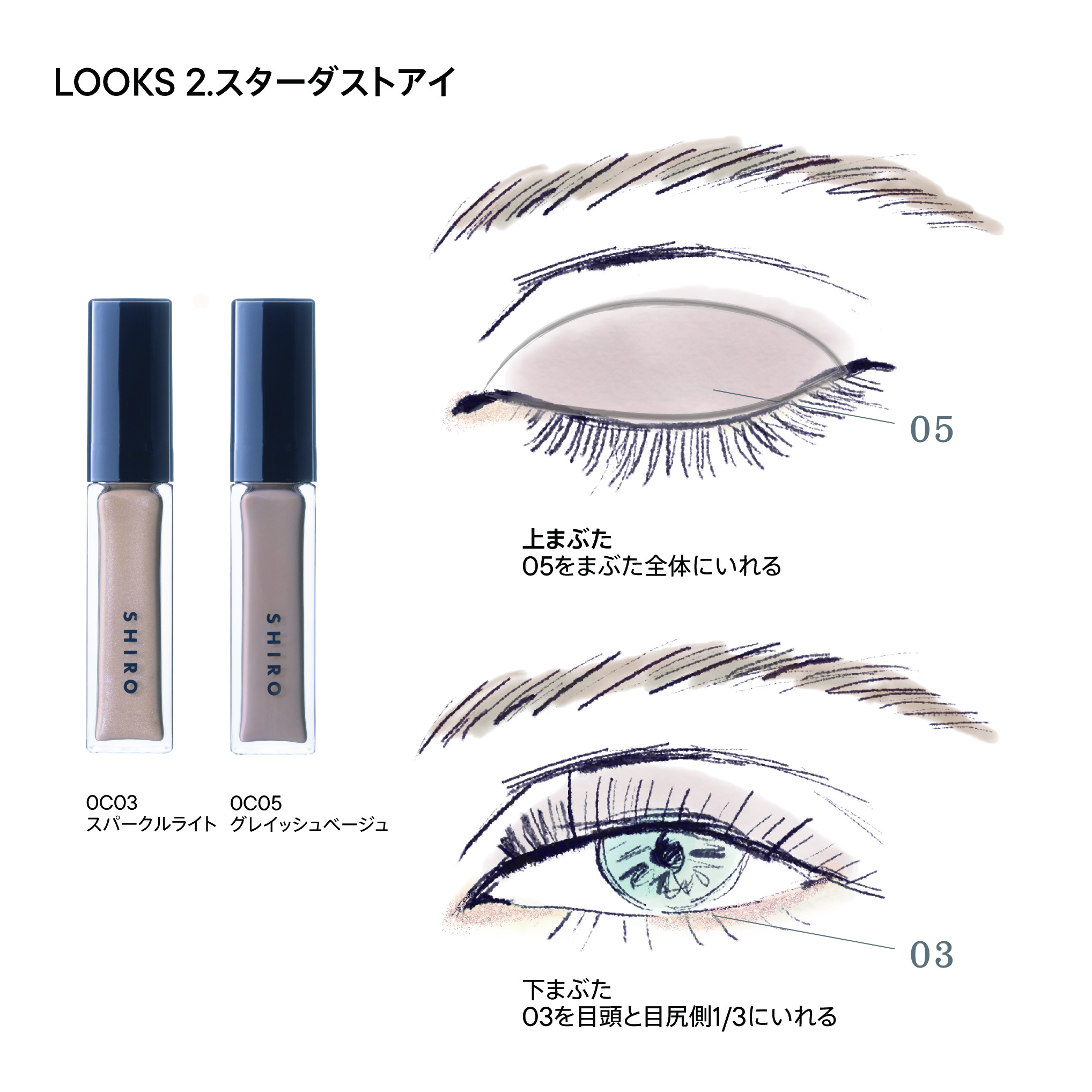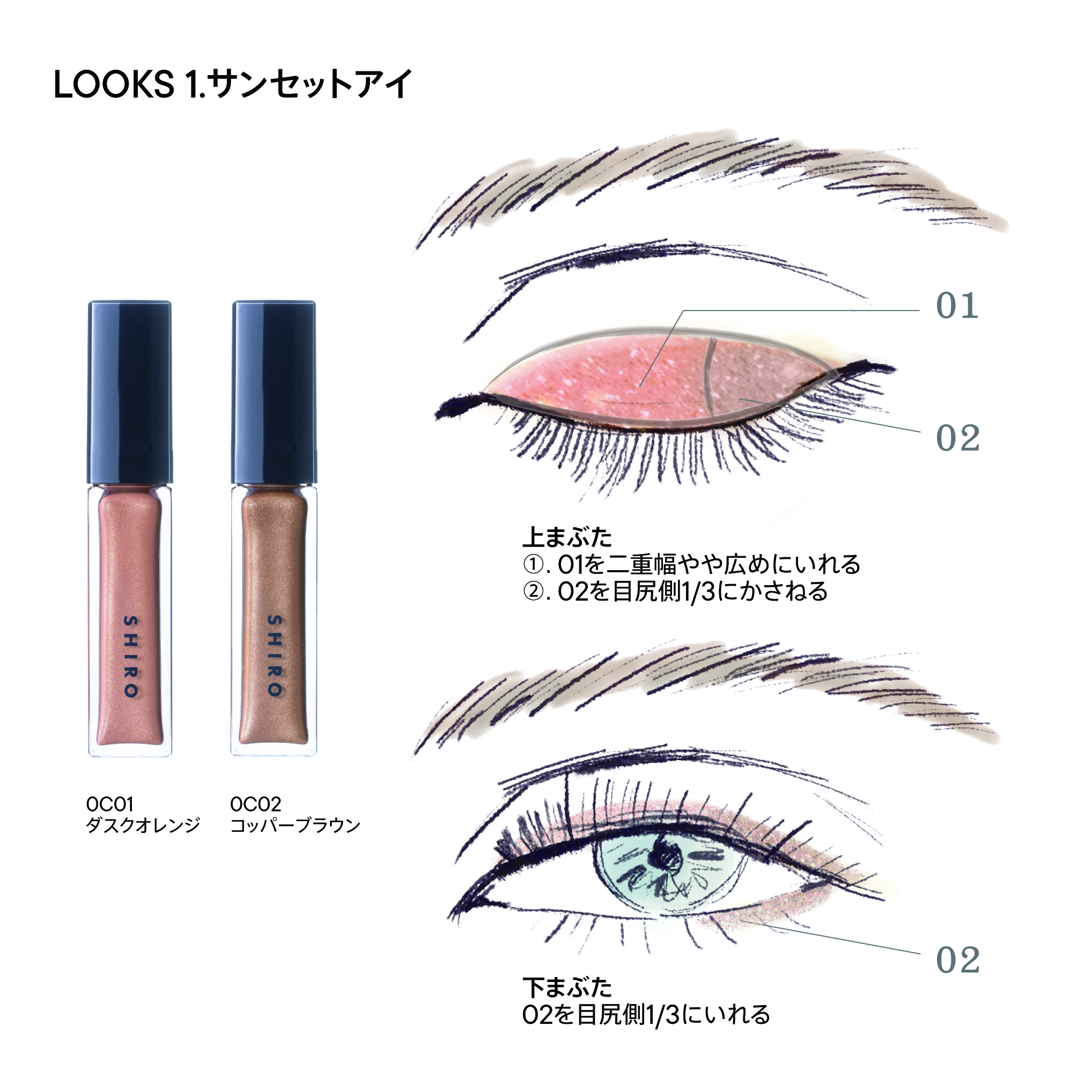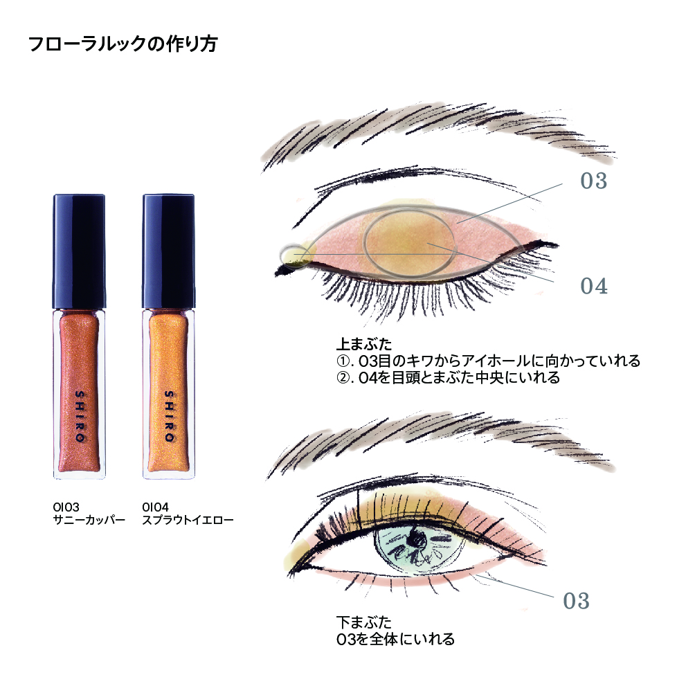 組み合わせも自由に遊べ、特に0I04 スプラウトイエローを二重幅にのせ、他3色の中からお好きなカラーを目尻側もしくはライン使いでいれると、目元が明るくなります。