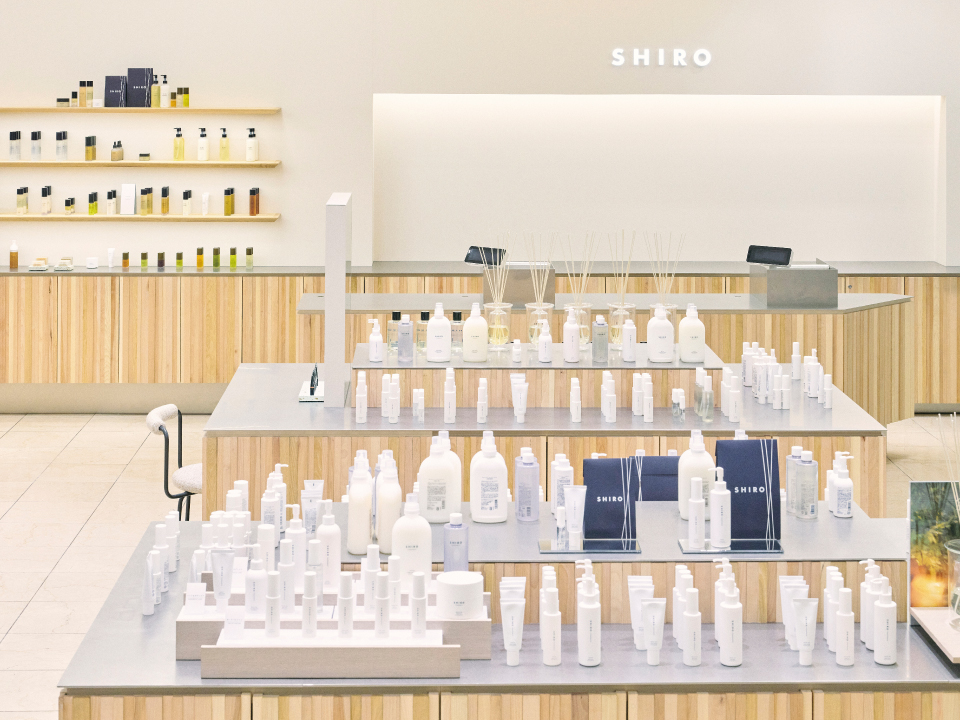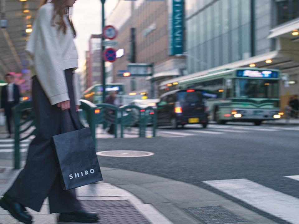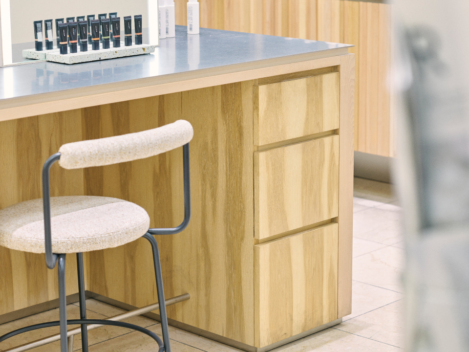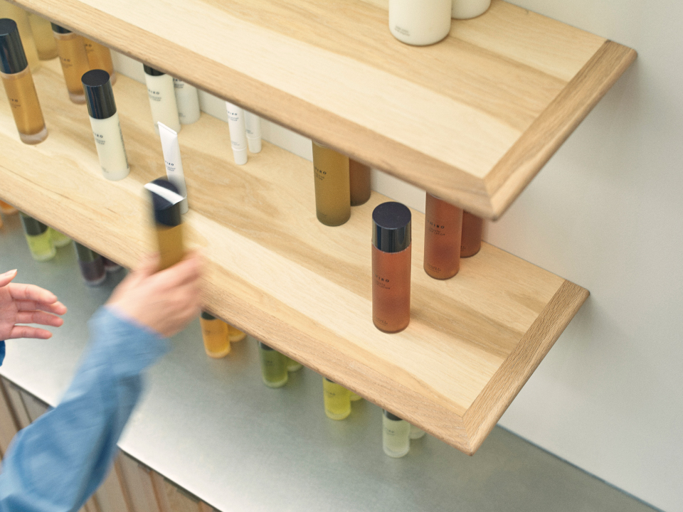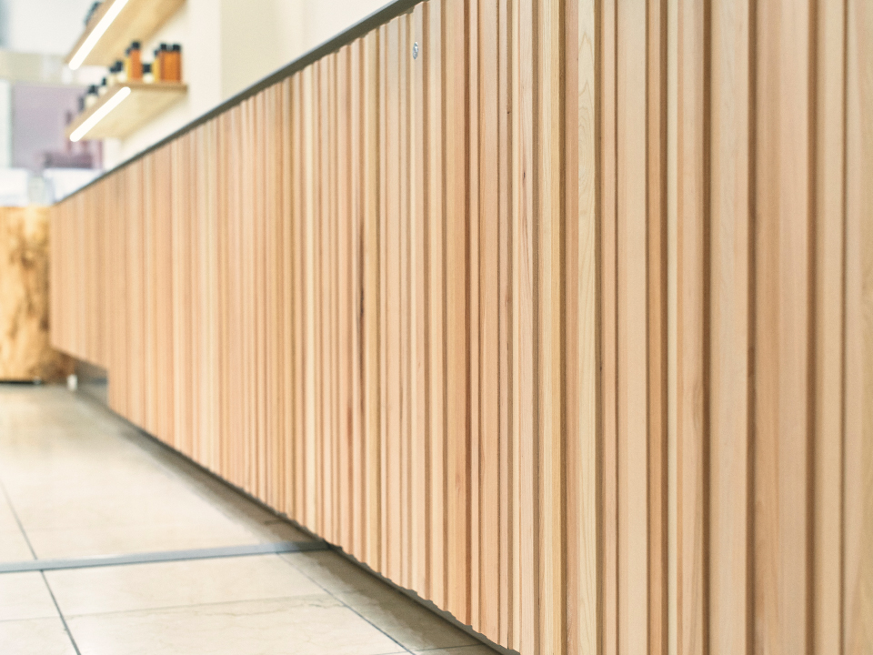 カウンターなどに使用している木材はすべて飛騨の森から届いたもの。京都の路地裏を思わせるリブ材には、加工に手間がかかる多種類の広葉樹の細い木や端材を使っています。入口には森に転がっていたトチの木をそのまま平台として設置。碁盤の目を想起させる店内と、日本の伝統色“薄香”の壁が、京都の街並みを思わせます。