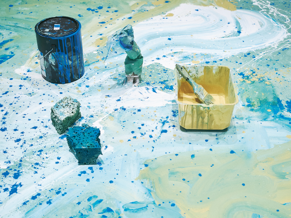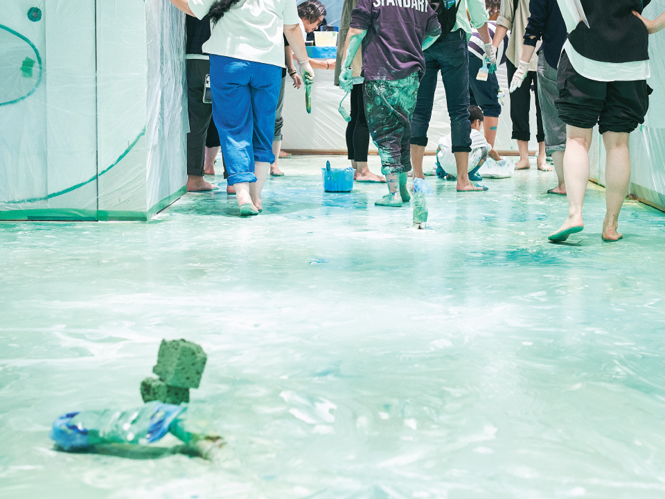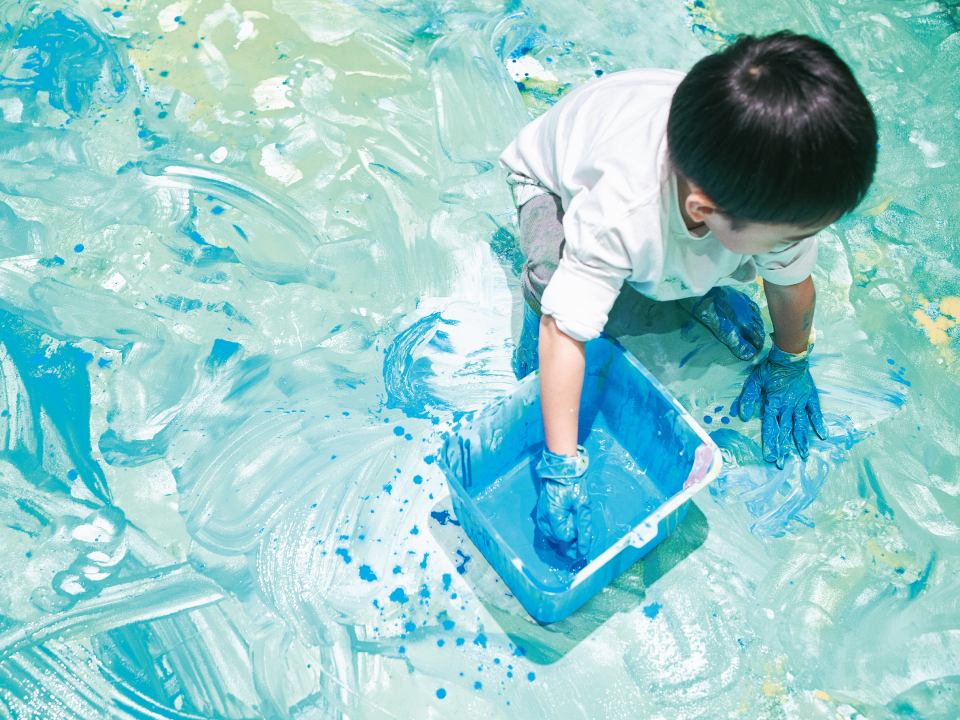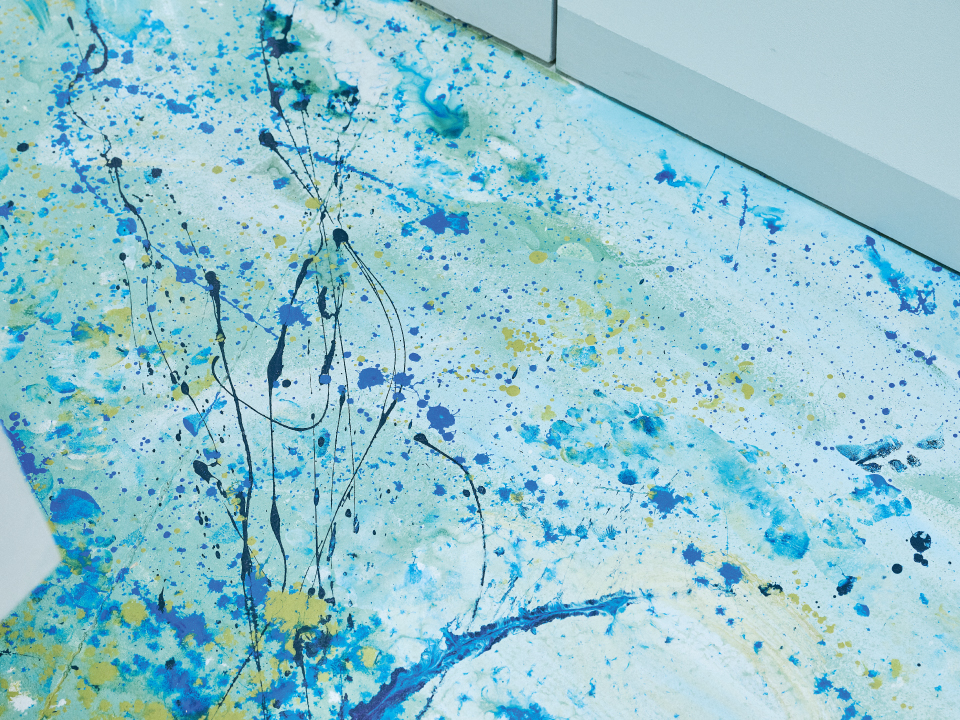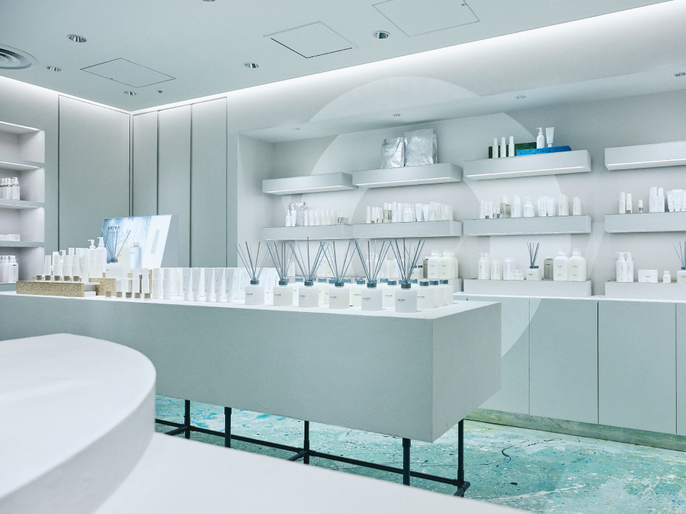 お店に入る前から目に入るカラフルな床は、お店づくりの中でSHIROを育ててくれたお客様と一緒にペイントした唯一無二のもの。製品が並ぶ壁面にはブランドサインを描き、店頭のLEDヴィジョンでは製品のビジュアルなどを見ることができます。お店づくりの工程も設計も開いた、新しいお店です。