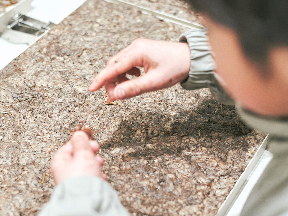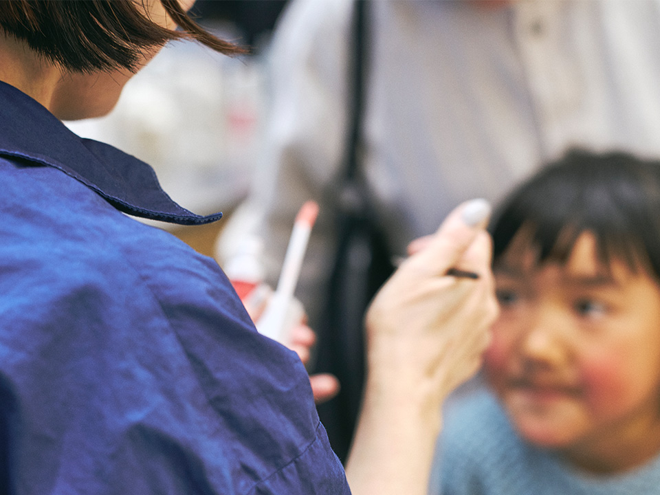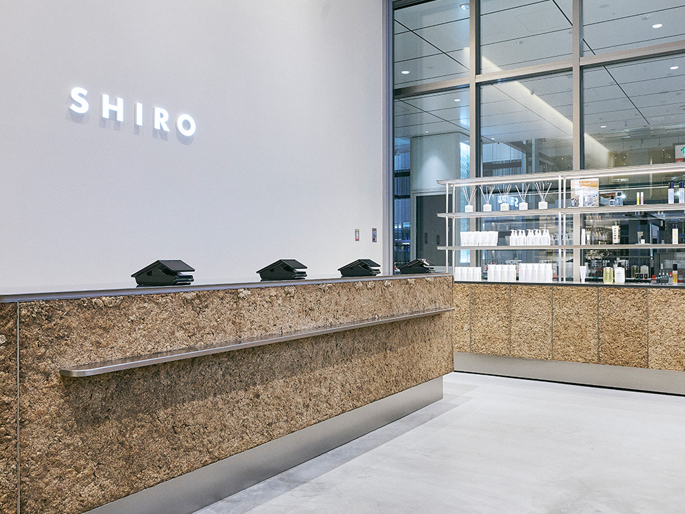 海や川、山などの穏やかな自然を背景に、暮らしの一部である路面電車が走り、さまざまな産業や伝統的な文化が盛んな広島。デニム製造の中で発生する綿の残渣をお客様と貼った什器や、ホーリーバジルの蒸留廃液で彩った壁面、既存の制服を藍染めして再活用し、大きなウィンドウからは路面電車の発着を臨むことができます。お店のあらゆる場所に地域らしさが詰まっています。