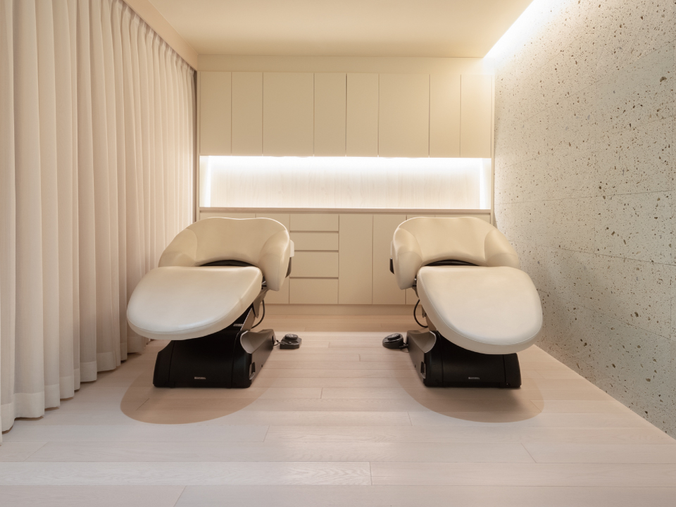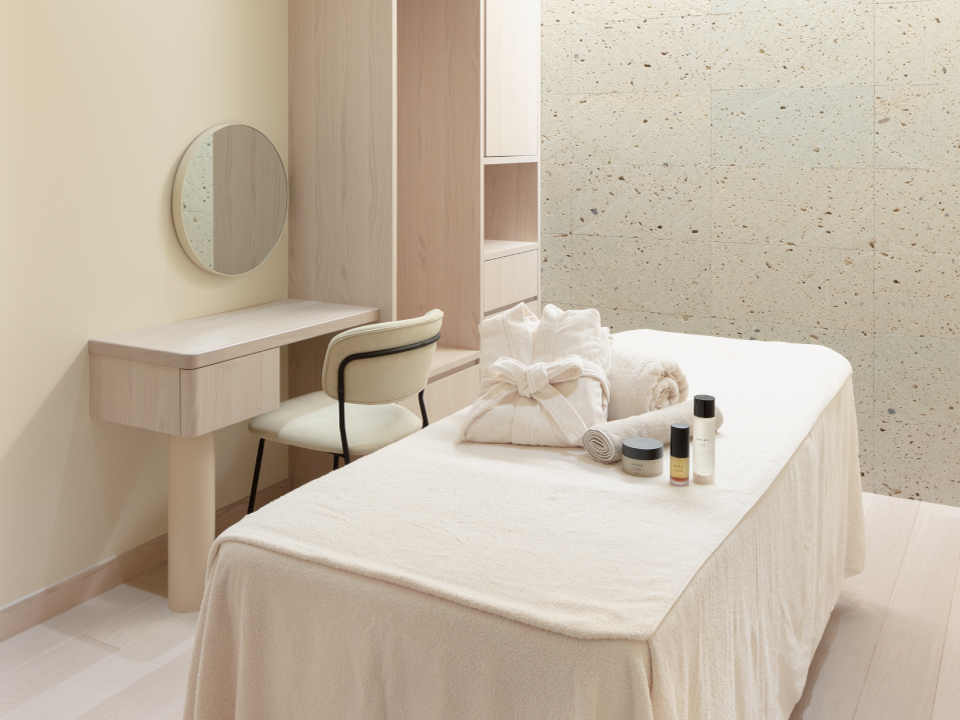 表参道本店と同じ建物内にある地下への階段を下ると、SHIRO PERFUMEのアイコンがお出迎え。店内全体をベージュトーンでまとめて統一感を出し、くつろぎながら心ほぐれる空間に。フェイシャル&ボディスパは、完全個室でご自身だけの時間をお過ごしいただけます。