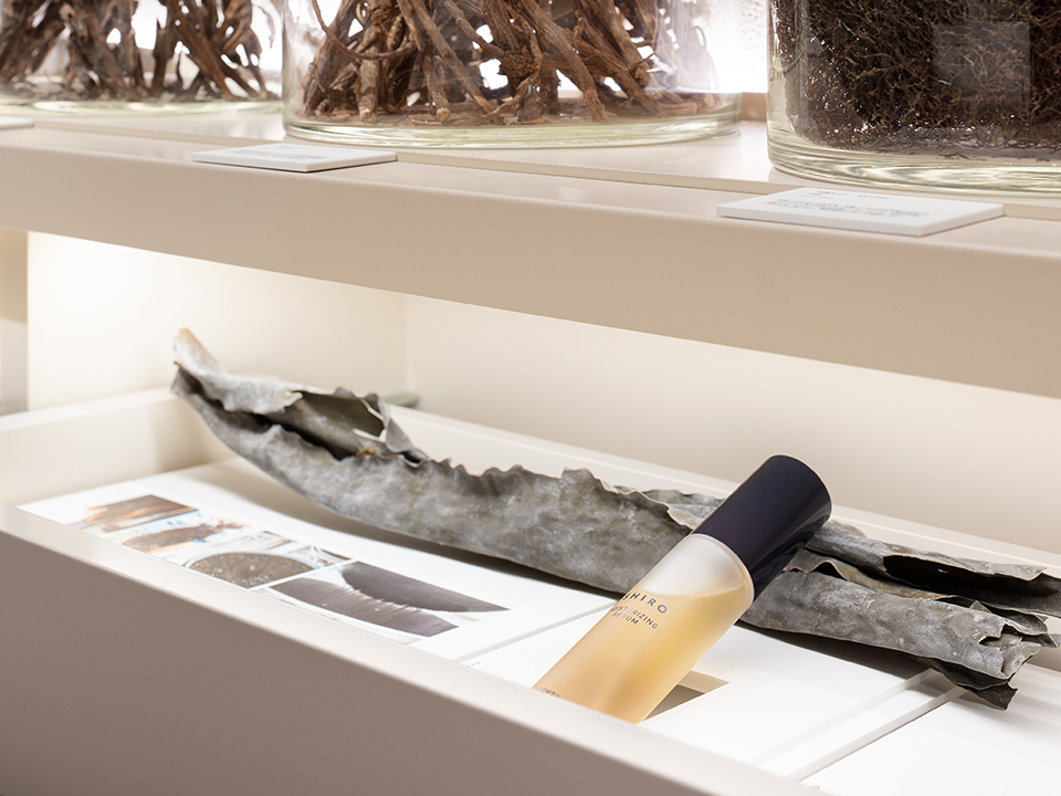 SHIROがこれまでに出会った自然素材を展示するミュージアムのような空間の旗艦店。製品に使用している本物の素材を見て、知って、触れながら、ゆっくりお買い物をお楽しみいただけます。壁面は異なる大きさの土や砂利を重ね地層のような模様を表現し、素材がいきいきと育ってきた豊かな土壌をイメージしています。