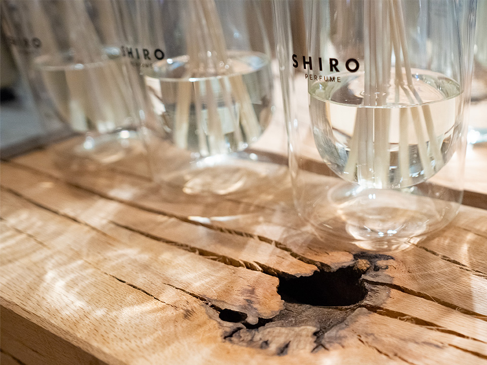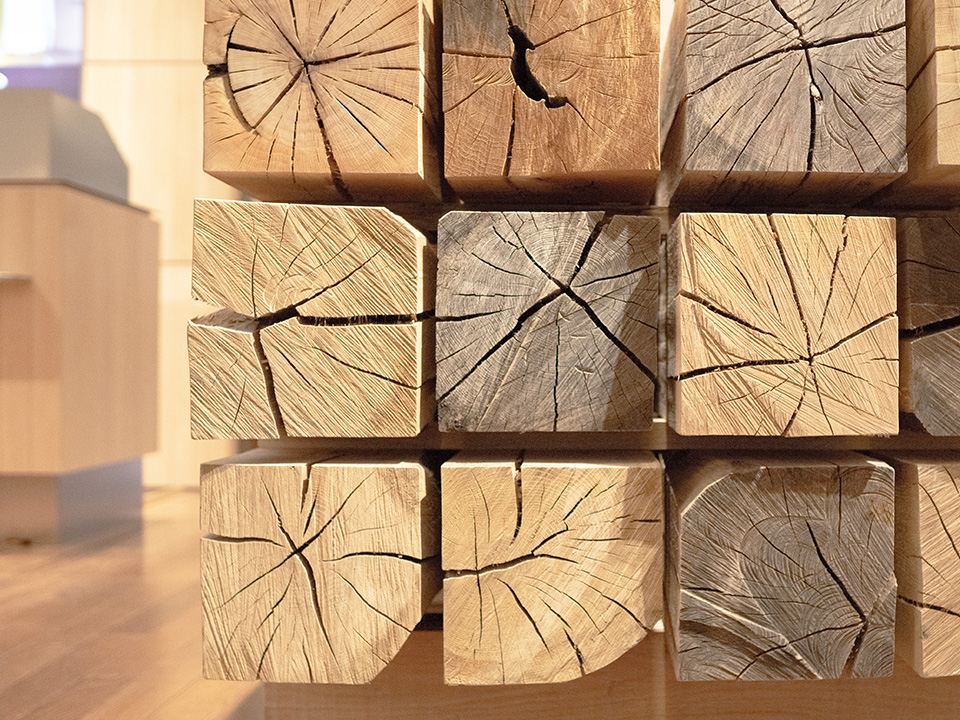 店舗正面に構えるディスプレイ什器は、兵庫県の山から間伐されたコナラやクヌギ、アベマキの角材を積み重ねています。色合いや木目などすべてが異なり、ありのままの姿で使うからこそ、自然にしかつくれない美しさが表れるのです。丸太状のクヌギは角材として切り出し、周りの部分は突板にして壁面や什器の側面に活かしています。