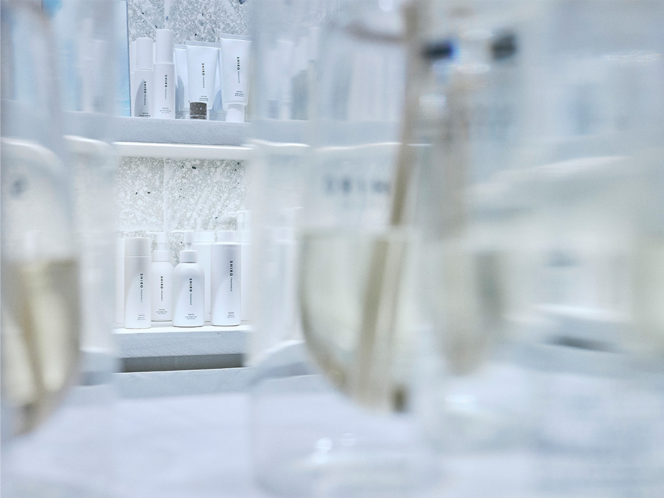 ディスプレイ什器のメインマテリアルである大谷石の特徴を活かしながら、漆喰で表層を彩ることで、店舗全体に明るい印象を与えてくれます。フロア内、どこに居てもSHIROのお店だと気づかせてくれるのは、店内中央の柱にある2枚のコルトン。ブランドの世界観を詰め込んだ、ビジュアルを目印にご来店ください。