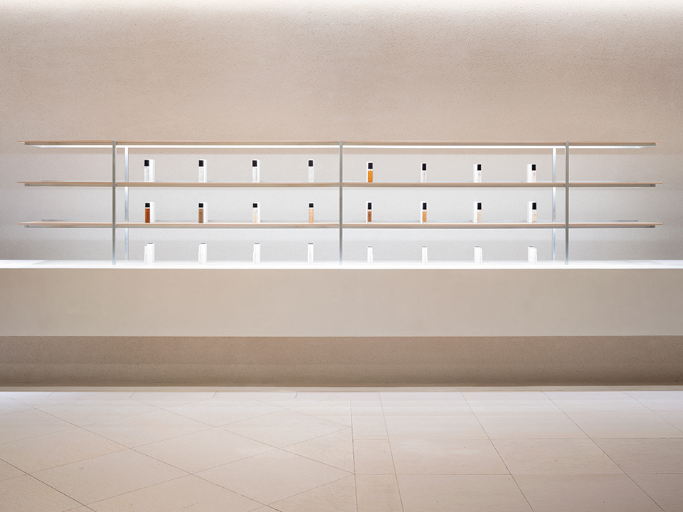 壁面は半乾きの状態で砂利などを掻き落とすことによって、絶妙な凹凸が繊細な陰影を生み出す仕様に。カウンターは手作業で丁寧に磨き、なめらかな質感に仕上げることで、製品のシンプルなデザインをより引き立てます。異なる質感のコントラストが、シンプルなイメージの空間にも意外性のあるリズムをもたらします。