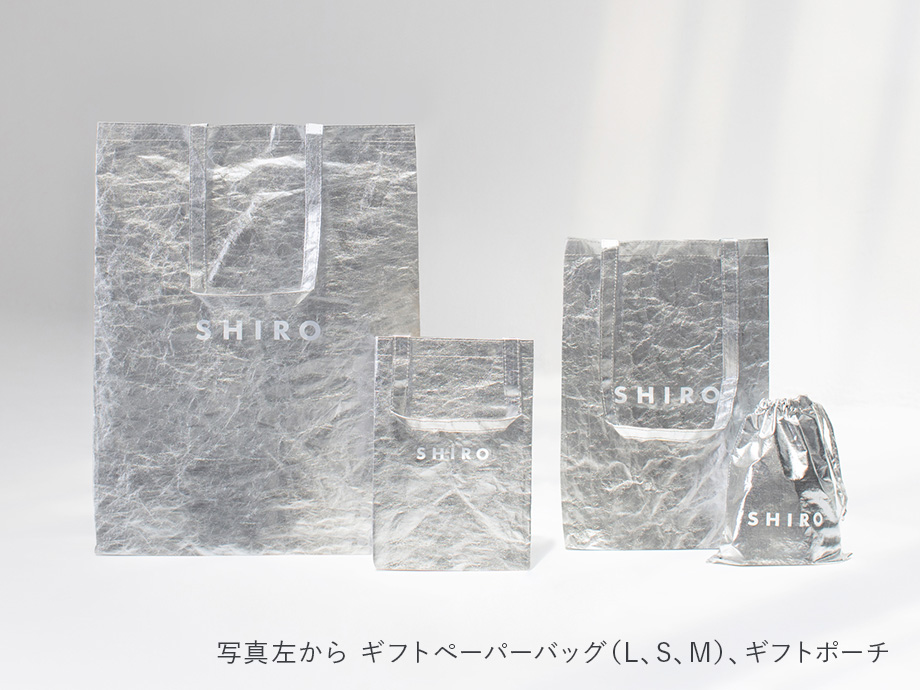 SHIROでは、限りある資源を守りたいという想いから、リユースできるギフトラッピングとして「ギフトペーパーバッグ」と「ギフトポーチ」をご用意しています。