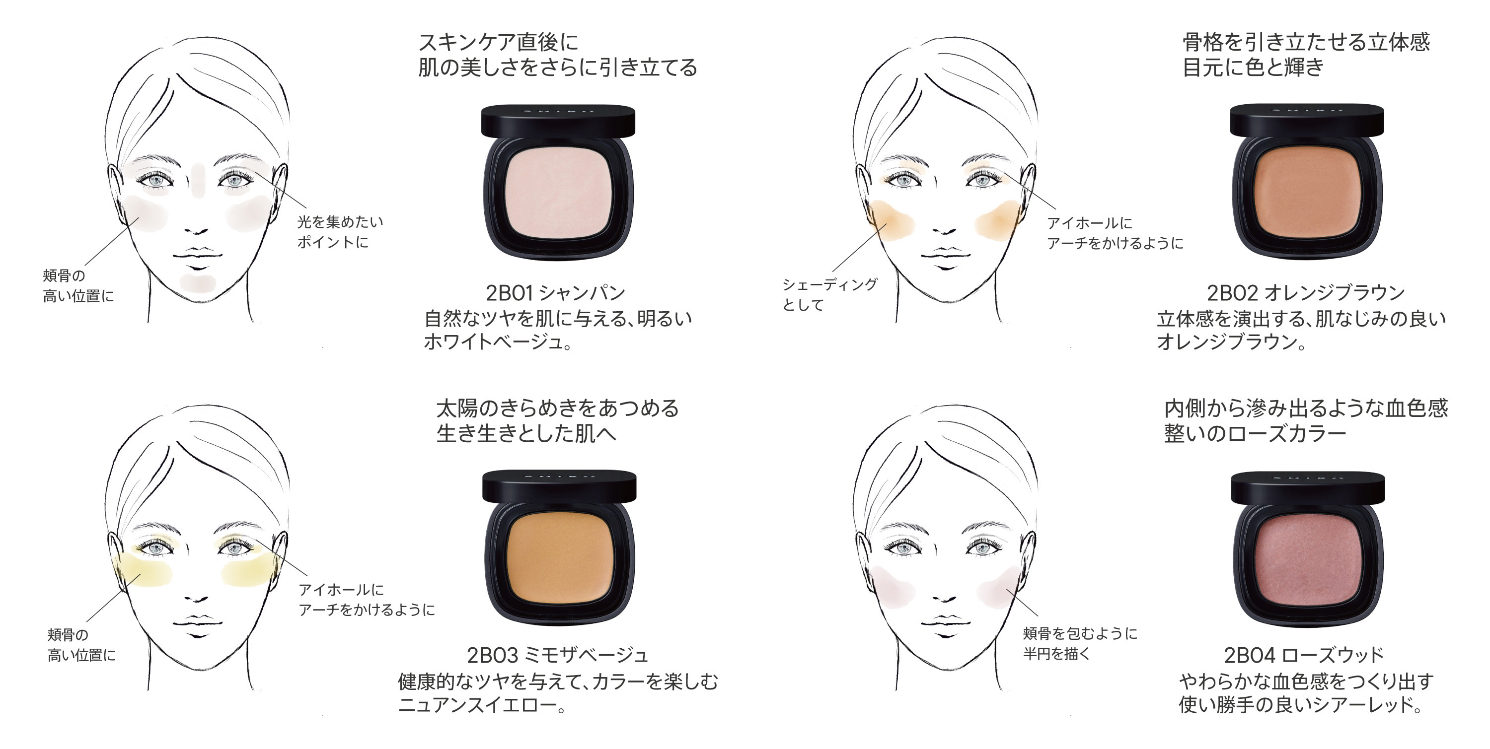 4色のラインナップは、それぞれ頬全体へ広げ、血色感をプラス。