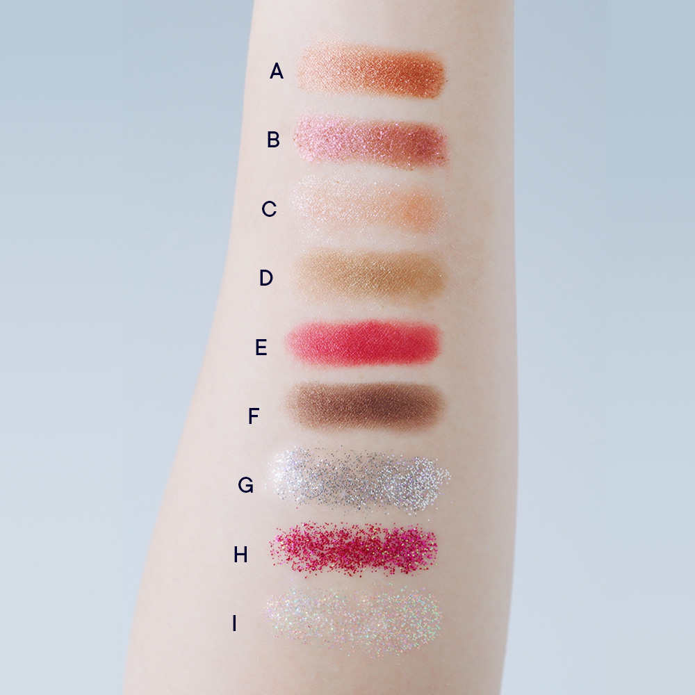 あえて鮮やかなカラーのラメや、まばたきするたびにキラキラ光るグリッターを9色セレクト。今まで選んだことのないカラーを手に取って、アイライナーや目尻部分にプラスしながら、“新しい自分”にときめいていただけたら嬉しいです。