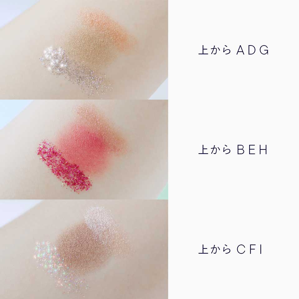 ・縦一列の3色を上段から中段の流れでレイヤードして、最後に下段の大粒グリッターをまぶた全体に塗布、またはアイラインに沿ってポイント使いするのもおすすめです。